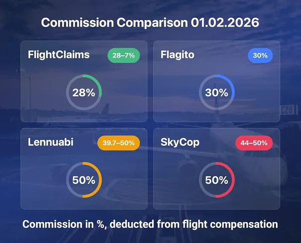 Our service fee is 28 % of the compensation successfully recovered from the airline. If FlightClaims becomes subject to VAT, the service fee will be 25 % + VAT.